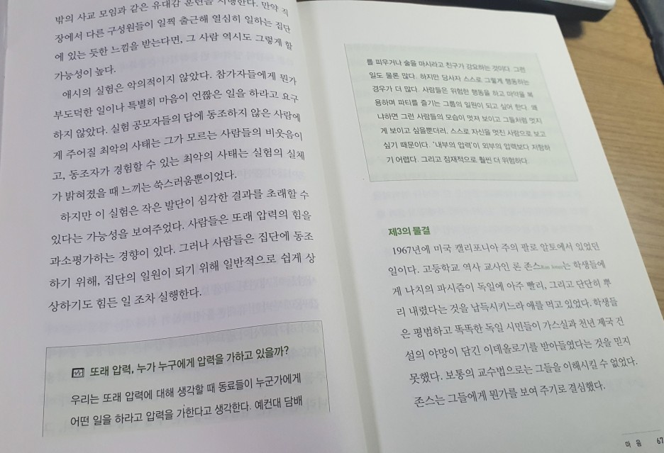 일반적으로 사람은 본인이 무리에서 소외되는 것을 굉장히 두려워하는 습성이 있기 때문에 스스로 언짢아하는 일이지만, 무리의 일원이 되기 위해 나 자신이 원하지 않는 일을 하고 있다고 책에서는 말합니다.