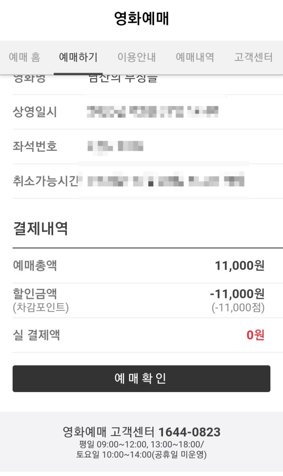 6. 할인금액이 11000원으로 0원에 무료 관람!