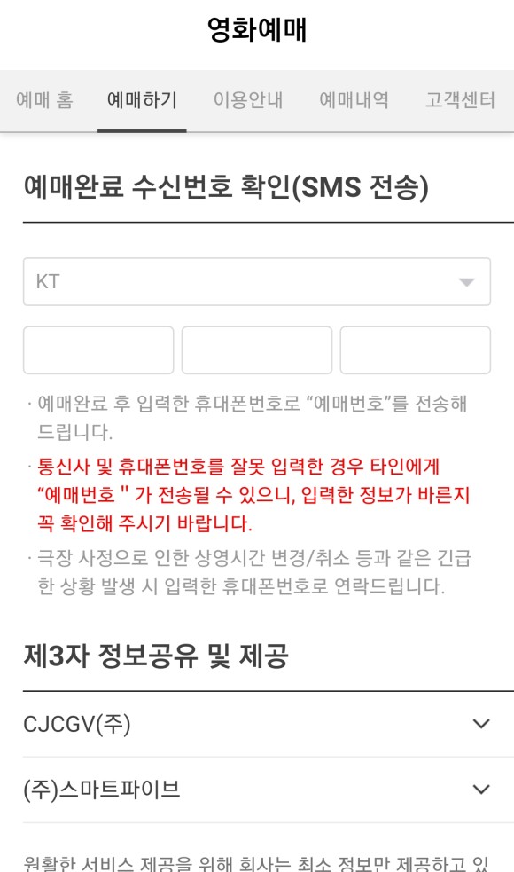 5. 영화관(cgv, 메가박스, 롯데시네마), 상영관(장소), 상영시간, 좌석을 선택하면 sms 전송을 통해 영화예매를 합니다.
